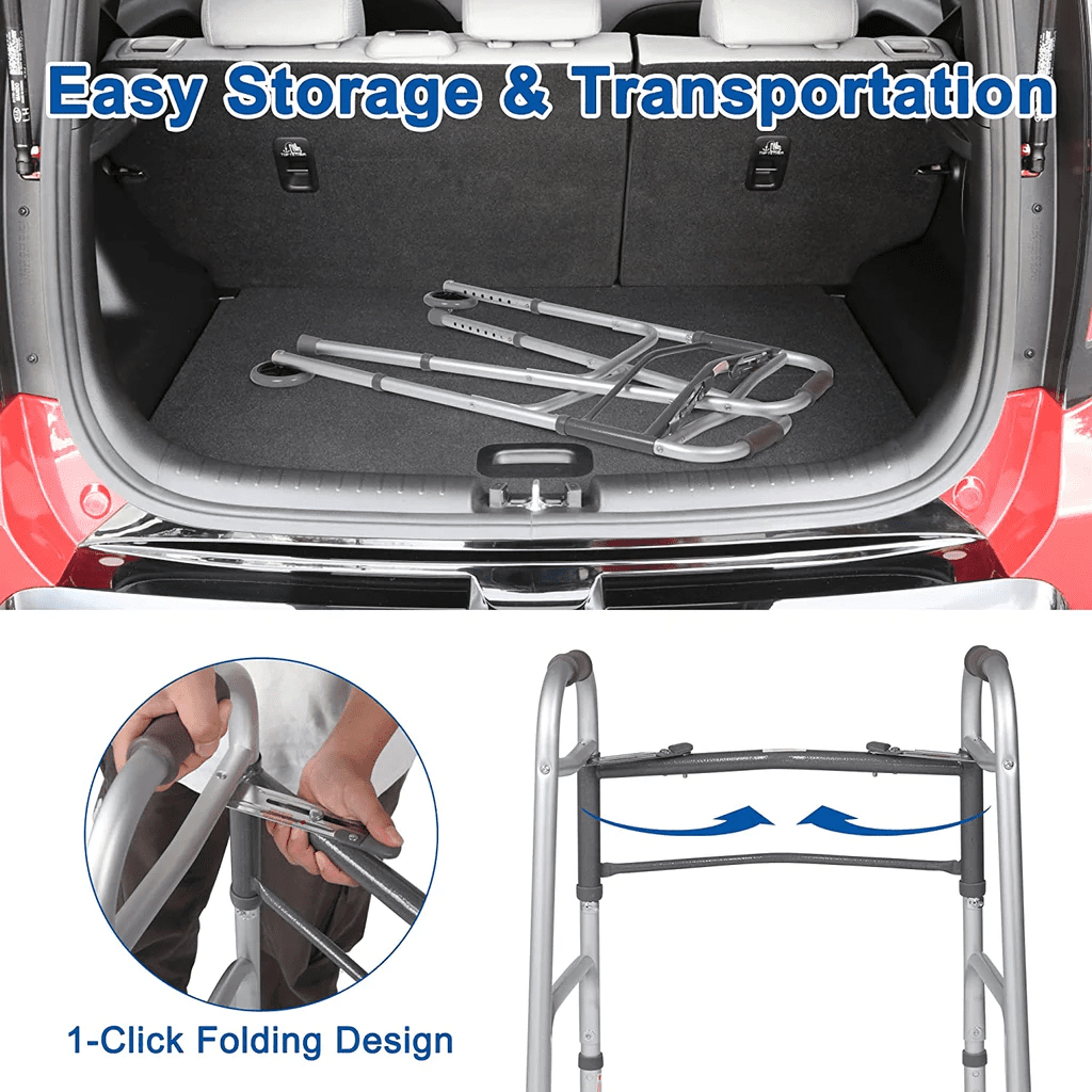 Easy To Fold & Portable: Featured with one click of the folding button, this standard walker helper can be folded easily. This walker with wheels is easy to transport in a car or a suitcase. The lightweight walking frame is suitable for indoor and outdoor use. Excellent folding mechanism for easy storage