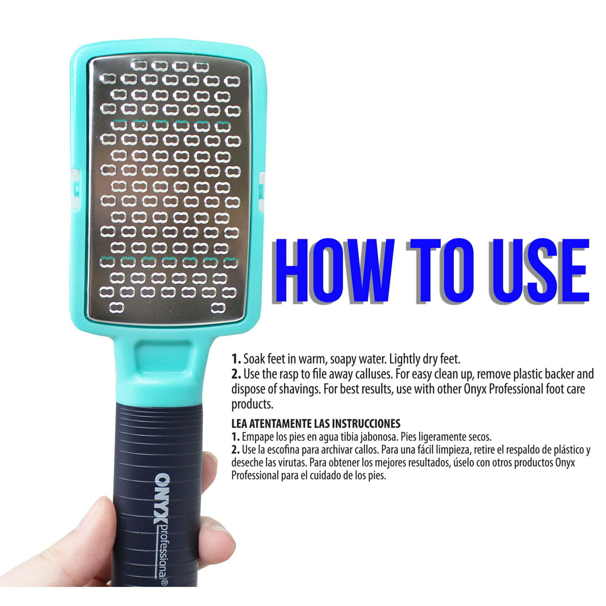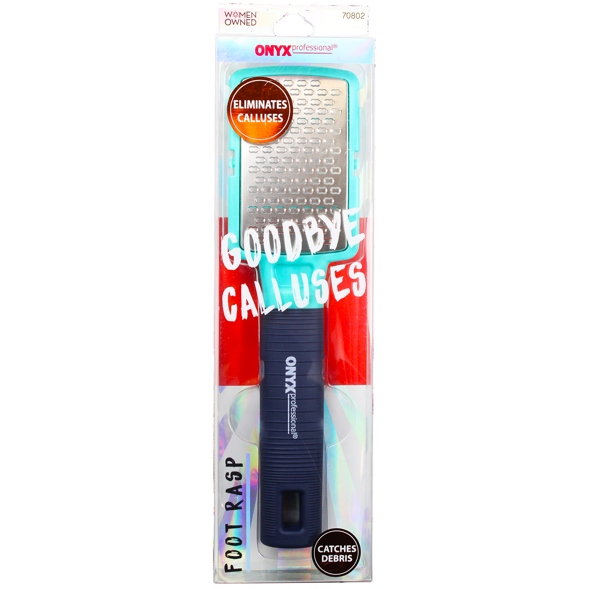 Get rid of calluses and dry skin with Onyx Professional’s Foot Rasp. At home pedicures have never been easier. Simply soak feet in warm, soapy water and lightly dry feet. Next, Take the foot file to any dry area of the foot. Whether winter has wreaked havoc on your soles, or an unsightly callus that just won’t go away, this foot rasp can conquer it all. Go up and down the affected areas with our foot rasp and watch it all disappear before your eyes! This rasp doesn’t stop there. We added a handy debris catcher to the back to rasp that allows for easy cleanup for at home pedis. Onyx Professional wants to give you the best quality out there. That is why we used stainless steel metal and a slim silicone grip. These two paired together boost the experience by making it safe and beneficial. Pamper your feet and give them the foot care and look they deserve! For maximum results, use with other Onyx Professional foot care items
