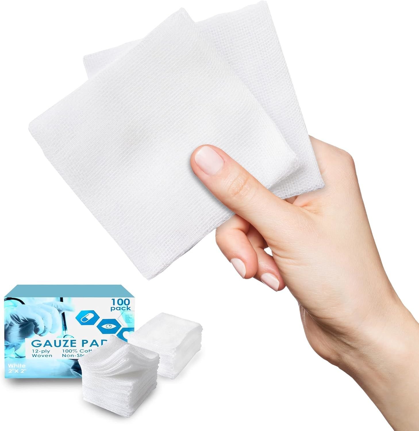 Gauze Sponges 2" x 2". Pack of 100 Non-Sterile 100% Woven Cotton Pads for Wounds Cleaning; Preparing. Medical 12-ply Gauze Dressings. Disposable Surgi