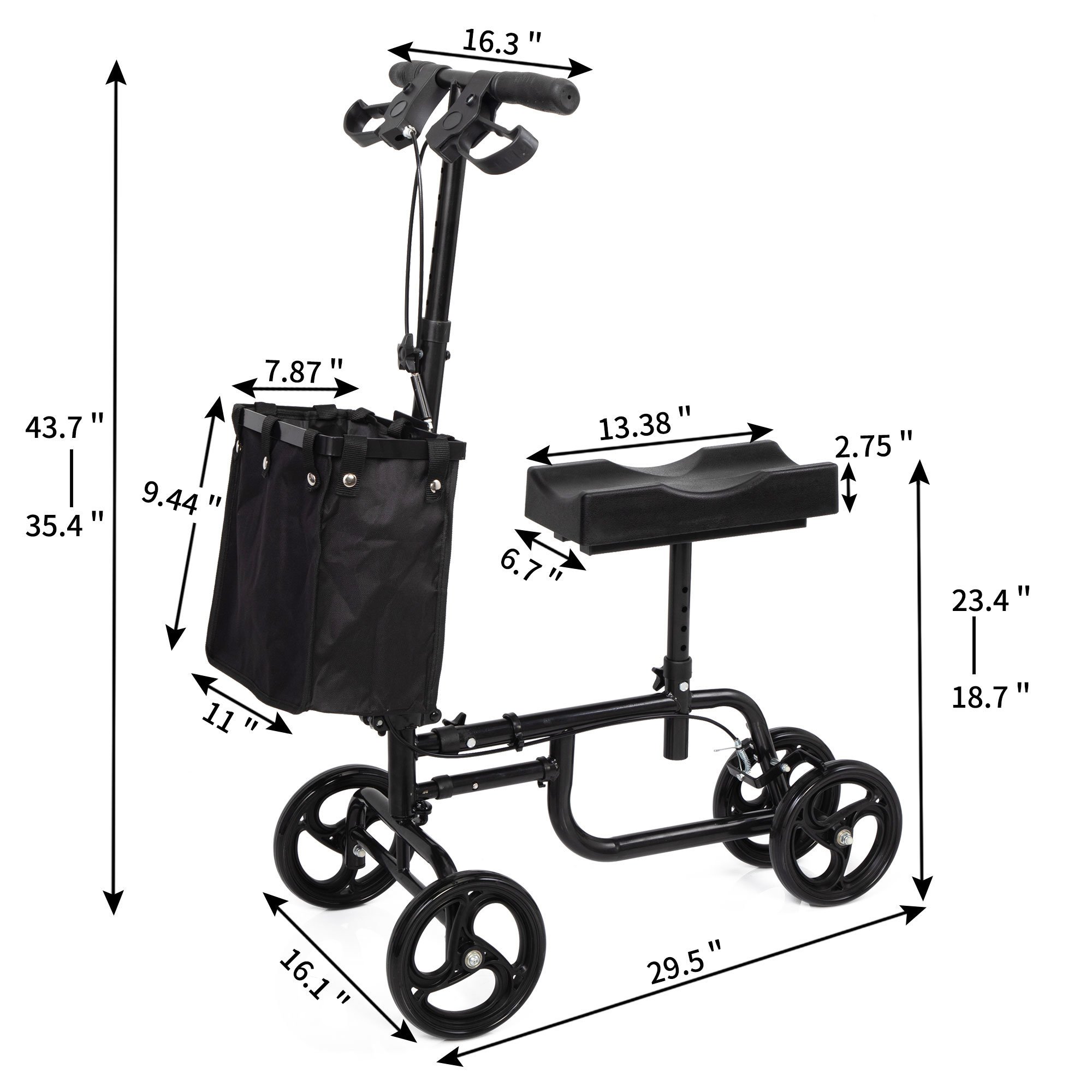 Specifications:Color: BlackMaterial: Iron + PVC + PU(Body iron,seat cushion PU,wheels PVC,iron pipes made of spray paint)Overall Dimensions: 33.86"L x 16.14"W x (35.63-42.72)"HKnee Pad Dimensions: 13.39"L x 6.69"W x 2.76"T(thick)Adjustable Height of Knee Platform: 18.11"-22.83"Each Wheel Diameter: 7.87"Bag Dimensions: 11.02"L x 7.87"W x 9.45"HMaximum Weight Capacity: 330 lbsNet Weight: 22 lbs