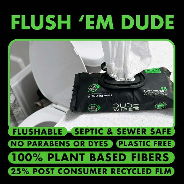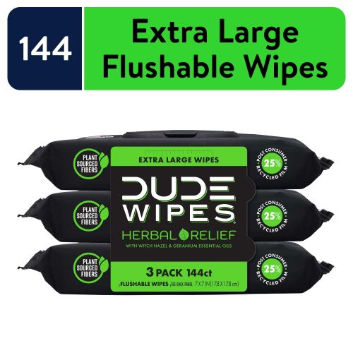 Send toilet paper back to the Stone Age where it belongs! As seen on Shark Tank, the new DUDE Wipes Herbal Relief Flushable Wipes are soaked with witch hazel and geranium essential oils, so you don't have to fear the aftermath of those extra spicy wings. Made with 99% water and plant-based ingredients, our butt wipes are gentle on your skin and formulated for a more refreshing feeling than toilet paper. So go ahead and tell your friends: you officially have the freshest butt in the game. When it comes to flushable wet wipes, size matters. Good thing we're big. We're up to 35% larger than the other guys (because nobody wants a little wipe after a big burrito). Our flushable wipes are made with plastic-free and plant-sourced fibers to help protect both the planet and your pipes, and they are free of fragrances, parabens, phthalates, and a bunch of other words that are really hard to spell. Unlike baby wipes, DUDE Wipes begin to break down once flushed, making them sewer-safe and septic-safe. Plus, each of our 144 plush wet wipes come in sleek dispenser packs with a flip-top that fit perfectly on your throne. So, just sit back, relax, and take in the sweet smell of those herbs, DUDE. These wipes smell great, feel great, and leave you super clean. So much better than dry toilet paper.