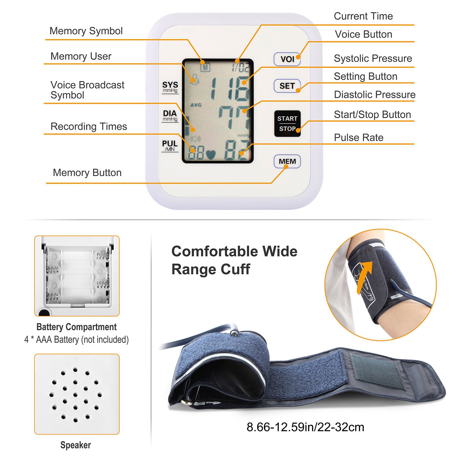 *Large LCD Display and Voice Broadcast*:All measurements will be clearly shown through its large and bright backlight LCD screen. Support voice reading and Convenience for users,especially the seniors. Displayed measurements include systolic pressure,diastolic pressure,pulse rate,date,time and user.