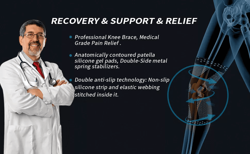 ✅ UPGRADED DESIGN ---Overcome the defects of similar products. medical-grade knee brace with no allergies and itchiness. Metal spring brackets and silicone pads won't fall off easily during use. Non-slip silicone strip and high-elastic fabric to avoid up and down-sliding and tumbling during exercise.