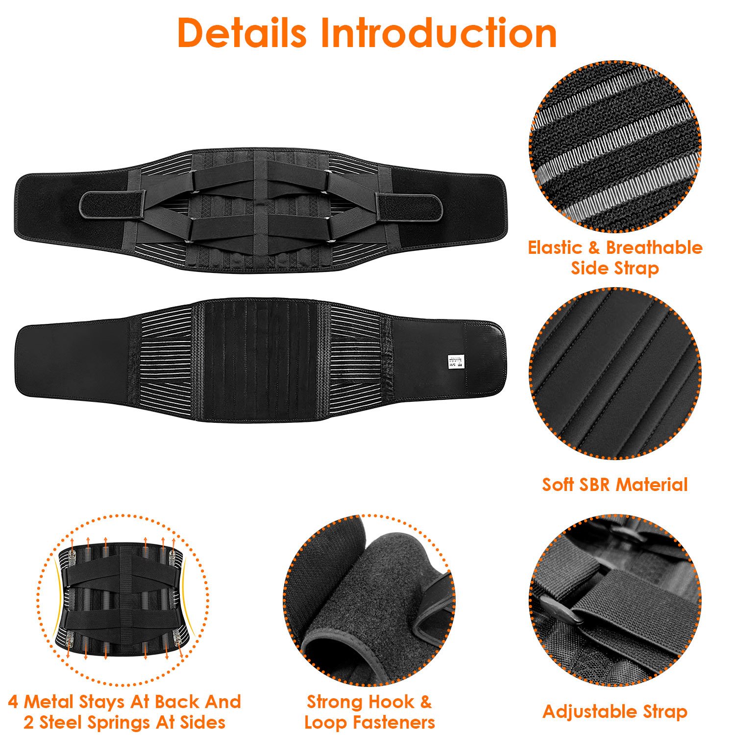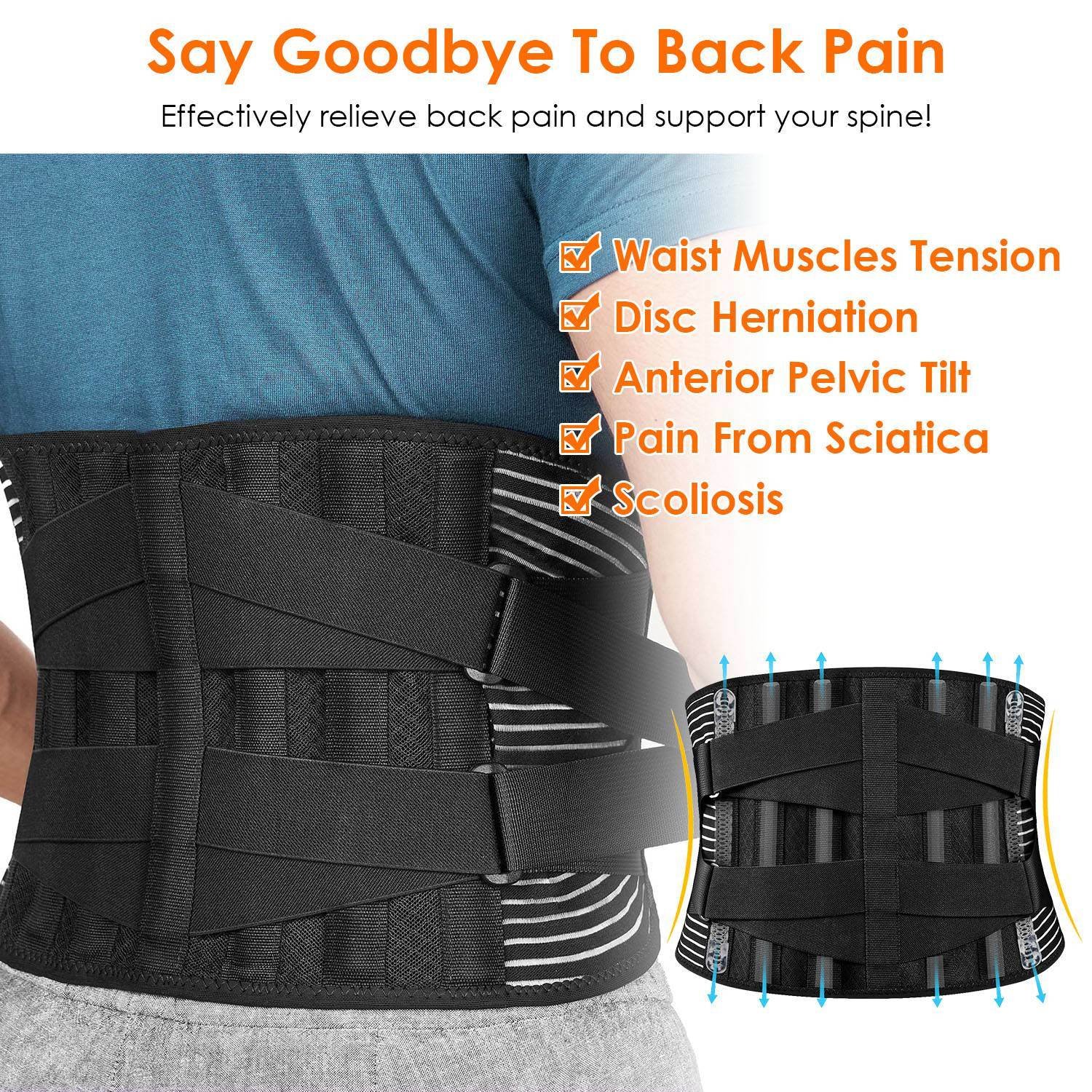 *Strong Supports*:Supported with 4 metal stays at back and 2 steel springs at the waist side; the lumber support brace can give your back strong and flexible support; preventing your waist from undue using and achieving spine decompression.