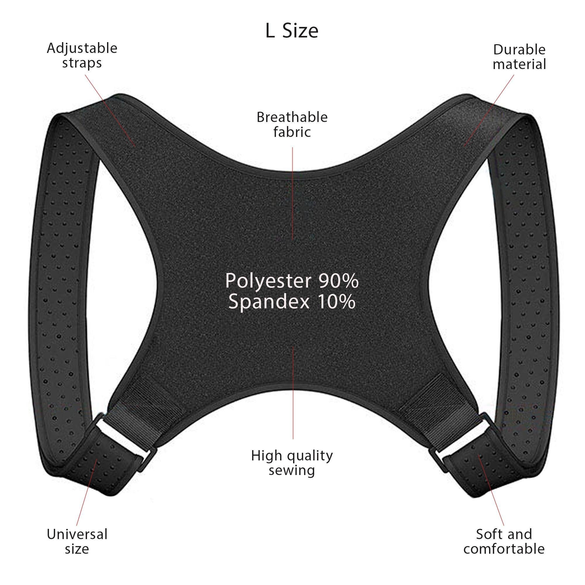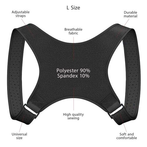 2.size: l. posture corrector fits men and women with l size chest circumference (27-43 inches). the adjustable straps of back brace is made of neoprene which won't irritate your skin. lightweight and durable the neoprene material in the posture corrector is: lightweight, breathable, water-resistant it has no latex and provides comfort for prolonged everyday usage. invisible under clothes the back corrector is lightweight and will not be noticed under shirt or blouse. you can use it while: